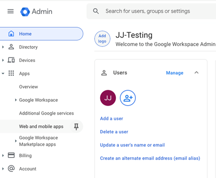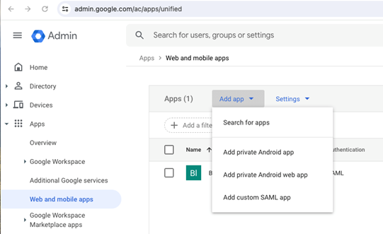 1. On the Admin Console for Google Workspaces, use the left navigation bar and go to Apps -> Web and Mobile Apps