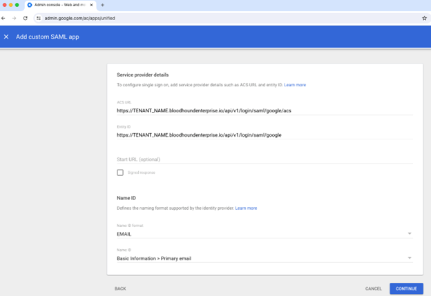 2. Enter the ACS URL and Entity ID as provided in the BloodHound Enterprise console: