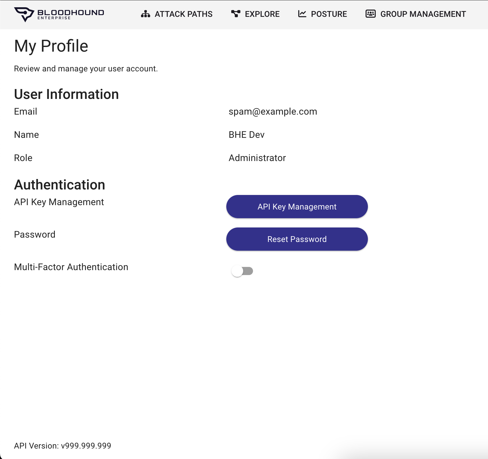 - API version on My Profile page - When BloodHound CE users report bugs, we ask, “What version are you running?” We never made that easily visible in the application - until now! Browse to the My Profile page under the configuration gear at the top right, and you’ll see what version you’re running at the bottom of the page.